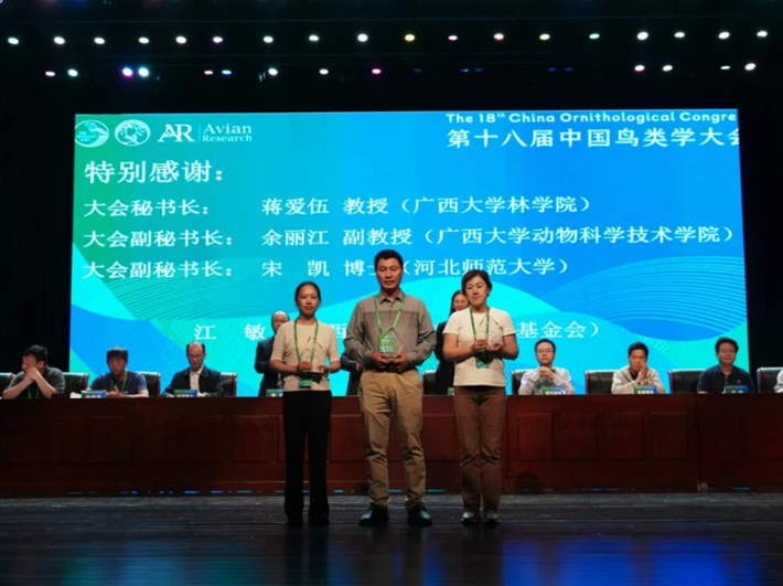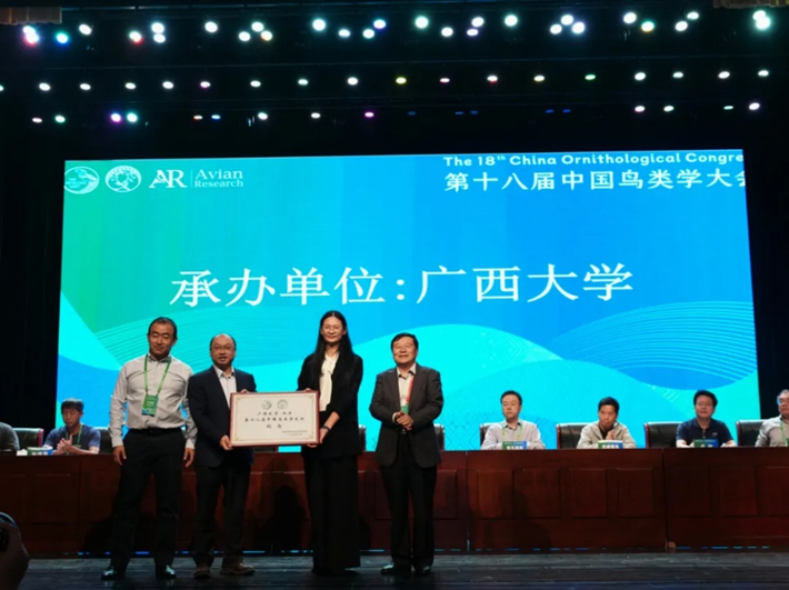 本次大会的圆满举办还离不开承办单位广西大学的大力支持。闭幕式上,张正旺主任委员向承办单位颁发了纪念牌,并对大会秘书长蒋爱伍教授等做出的突出贡献表示感谢。大会宣布第十九届中国鸟类学大会将于2027年在云南昆明举办,中国科学院昆明动物研究所吴飞副研究员代表三家联合承办单位介绍了云南的鸟类资源和下一届鸟类学大会的构想,诚邀全球学者共赴下一届鸟类学盛会。最后丁长青教授宣布第十八届中国鸟类学大会胜利闭幕。