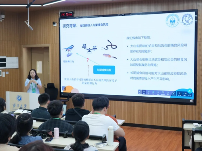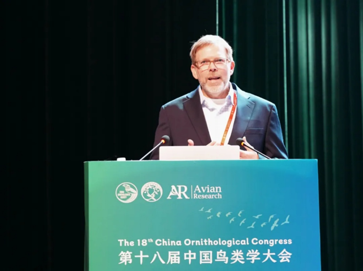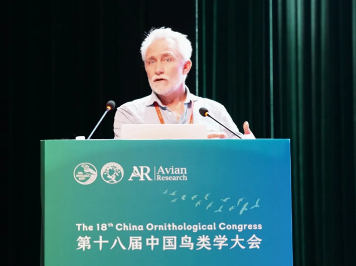 在大会报告中,中国科学院古脊椎动物与古人类研究所王敏研究员系统介绍了鸟类的深时演化,基于化石证据揭示了鸟类起源与多样化进程的关键节点,为理解鸟类演化史提供了新框架。英国牛津大学Tim Coulson教授阐述了生态学与演化生物学的统一框架,解释了岛屿极大型和极小型物种的存在机制,并强调了气候变化对鸟类种群动态的影响。华东师范大学斯幸峰教授分析了岛屿鸟类食果网络的结构与动态,揭示了种间互作在生态恢复中的作用,为岛屿生物多样性保护提供了理论依据。美国康奈尔鸟类学实验室Brian Sullivan先生介绍了eBird等鸟类公民科学平台,强调了收集和发布鸟类分布数据的重要性以及公民科学在鸟类研究中的重要意义。英国帝国理工学院Joseph Tobias教授介绍了功能性状在鸟类生态、演化与保护研究中的应用,展示了如何利用性状数据预测种群响应。广西大学蒋爱伍教授回顾了喀斯特森林鸟类研究的历史和最新进展,研究工作涵盖了从鸟类区系调查到对全球变化响应的多个方面,突出了鸟类在生态保护中的重要意义。
