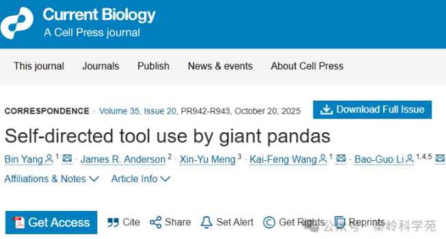 2025年10月20日,西北大学李保国教授和陕西省动物研究所杨斌副研究员团队在Cell出版社旗下国际著名期刊Current Biology在线发表题为“Self-directed tool use by giant pandas”的研究论文。该论文通过对笼养大熊猫行为研究,首次提供了大熊猫使用自我指向工具的新证据。这项工作对于研究工具使用的起源和演化具有重要的科学价值和意义。