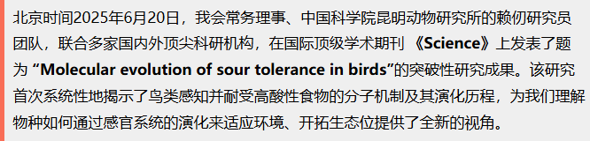 正如论文通讯作者 赖仞研究员所言:“鸟类的‘吃酸’能力,是自然选择讲述着生命如何以性状创新应对环境挑战和拓展生态空间的故事。”