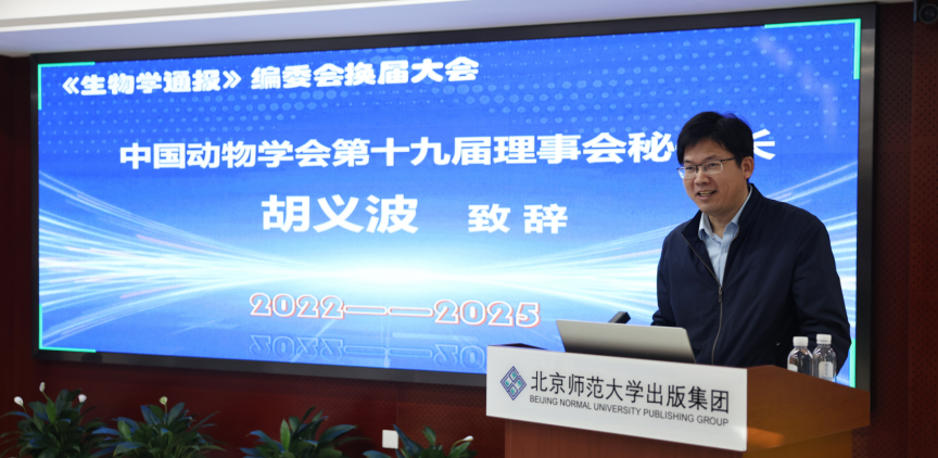 《生物学通报》第一主办单位中国动物学会的第十九届理事会秘书长胡义波致辞,胡秘书长高度肯定了2022届编委会在提升期刊内容质量、优化学术影响力、推动期刊持续健康发展等方面的重要贡献,对新一届编委在把握学科前沿、深化教学实践、引领生物学发展等方向提出了建设意见,同时表明将与共同主办单位一道一如既往支持《生物学通报》的发展。