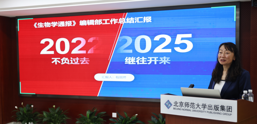 大会包括两个部分议程,第一部分是编委会换届,由北京师范大学出版集团副书记、期刊社社长郑伟主持,第二部分是2025届编委会工作研讨,由北京大学教授,《生物学通报》副主编、编委王月丹主持。