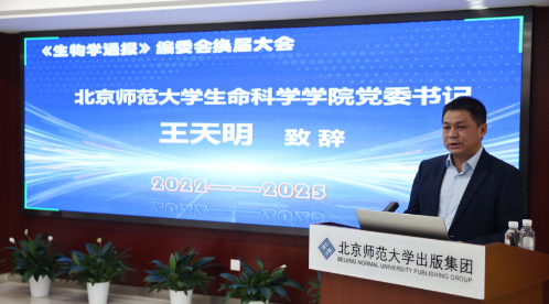《生物学通报》共建单位北京师范大学生命科学学院的党委书记王天明致辞,王书记表示,生命科学学院将继续与出版集团紧密配合,共建共管期刊的有序发展,积极拓展基于学科教育与教师专业发展的特色合作项目,共同推动“学术共同体”建设,依托“优师计划”,助力生物学领域优秀教师的培养与专业成长。