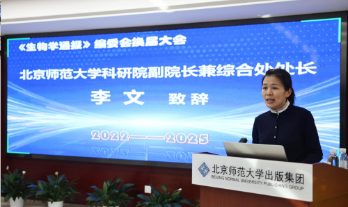 《生物学通报》主办单位北京师范大学的科研院副院长兼综合处处长李文致辞,李处长在致辞中提到“新一届编委会的成立,标志着《生物学通报》站上了新的历史起点,肩负起继往开来的时代使命”,对《生物学通报》未来发展提出三点要求:“坚守使命,服务育人根本”;“推动创新,促进融合发展”;“追求卓越,提升办刊质量”,并表示愿与中国动物学会、中国植物学会携手并肩,群策群力,共同将《生物学通报》打造成内涵深厚、特色鲜明的高水平一流期刊。