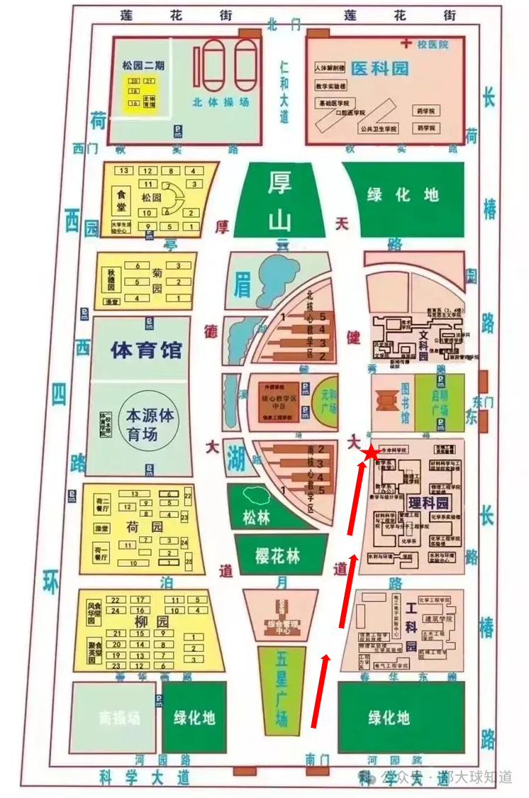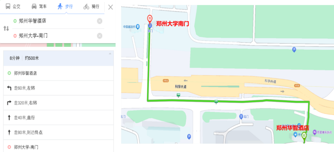 华智酒店步行约500米到达郑州大学南门,郑州大学南门步行约900米到达郑州大学生命科学学院301室。